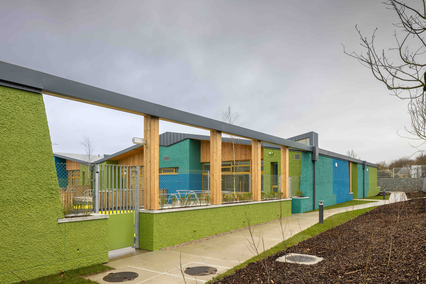 The extensive single storey building steps with the site topography and is capped by a continuous roofscape folded and perforated to provide for light and ventilation. It folds down to provide a large timber-soffited canopy to the front for shelter at drop-off and collection. Wet dash external render is painted in panels of rich blues and green to tie the overall form into the prevailing geology and greenery. This expression seeks to break down the scale and present a less institutional public face while foregrounding the school as an inclusive, friendly, and characterful presence in the community.